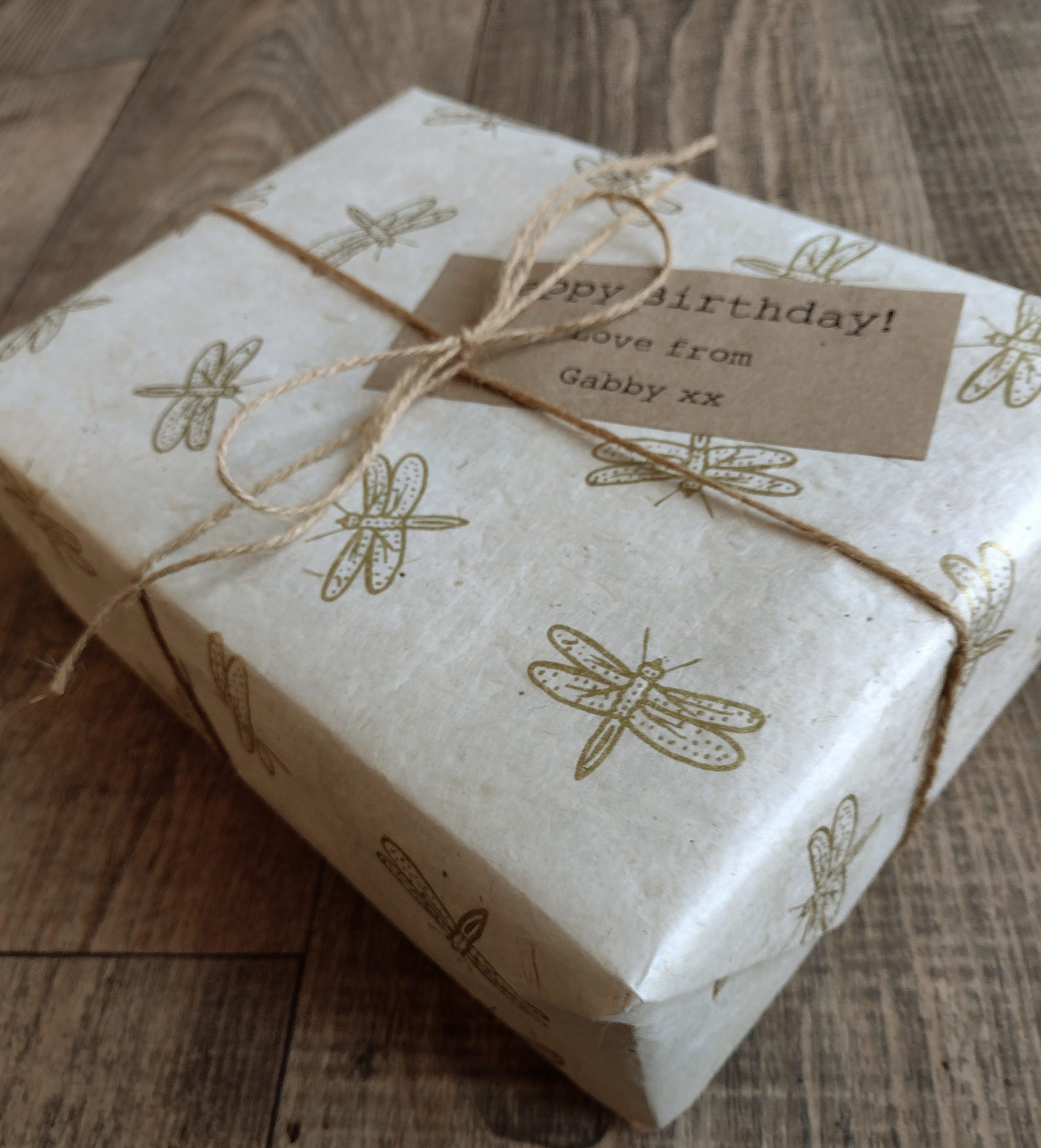 We gift wrap in our hand made paper, and tie with twine.